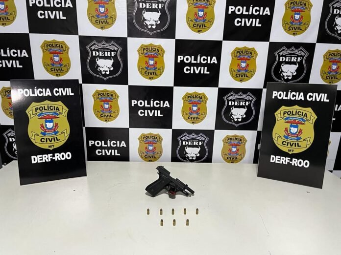 A equipe policial seguiu até a residência de onde o suspeito saiu e um casal, que alegou ser dono do local, autorizou a entrada dos investigadores e no quarto onde o criminoso ficava foi encontrada, dentro de uma cômoda, uma pistola de calibre 380 com munições. A arma estava com parte da numeração raspada.