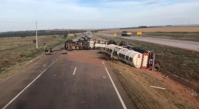As informações preliminares apontam que a carreta tombou e houve derramamento de combustível na pista norte e também no canteiro central da rodovia, aumentando o risco de acidentes e exigindo a adoção imediata de medidas de segurança.