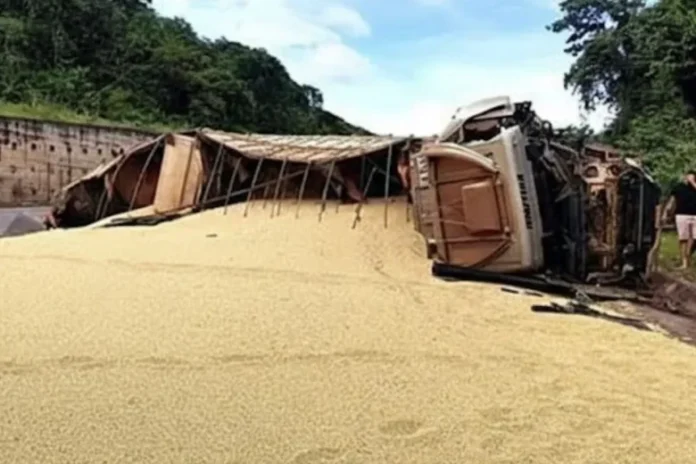 Um grave acidente mobilizou as equipes de resgate e a Polícia Rodoviária Federal (PRF) na tarde deste sábado (7), no km 575 da BR-364, em Nobres/MT. Uma carreta carregada com soja tombou após apresentar uma falha mecânica no sistema de freios, interditando totalmente o trecho por algumas horas e espalhando a carga pela rodovia.