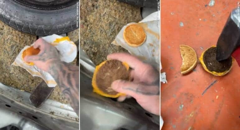 Um mecânico encontrou um hambúrguer esquecido há anos no porta-malas de um carro, E, para surpresa dele, a aparência do lanche era quase a mesma de um que acabou de sair do forno — com a exceção de que ficou “duro como cimento”, segundo ele.