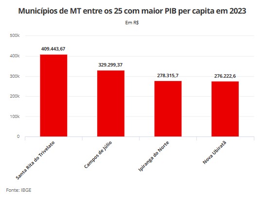O peso do agro e a menor densidade populacional. Esses são os dois principais fatores que colocaram Santa Rita do Trivelato, a 445 km de Cuiabá, entre os sete municípios do país com maior PIB per capita, em 2023, de acordo com dados divulgados nesta sexta-feira (19) pelo Instituto Brasileiro de Geografia e Estatística (IBGE).