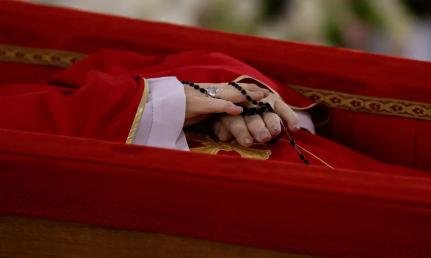 Jorge Mario Bergoglio será velado em um caixão aberto feito de madeira e zinco, vestido com uma casula vermelha e mitra branca, segurando um rosário. O caixão será fechado às 20 horas (15h em Brasília) de sexta-feira, 25.