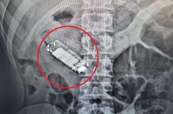 Porém, na UPA, a descoberta chocante: um exame de raio-X revelou que as dores abdominais intensas que o paciente sentia estavam sendo causadas por um mini aparelho celular engolido pelo detento e que acabou ficando preso no seu sistema digestivo, obstruindo assim o fluxo normal de líquidos e alimentos.