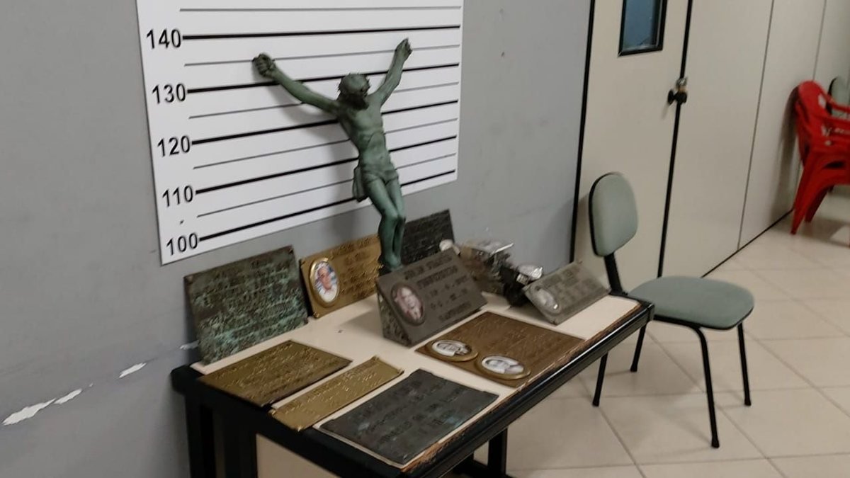 Ela, no entanto, permaneceu com os policiais e demais participantes da operação. No local, foram realizadas buscas e encontradas nove placas de metal e uma imagem religiosa. Os itens haviam sido furtados do cemitério municipal do Paquetá.