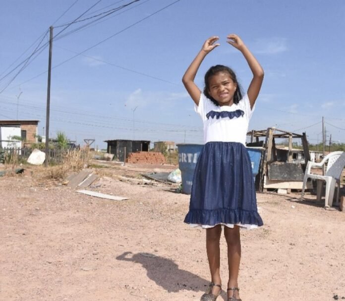 Ana Maria Bolanes, de 7 anos, é de uma família indígena venezuelana e mora com mais nove pessoas em um barraco de apenas dois cômodos, em uma das ocupações do Contorno Leste, conhecida como Flor do Leste, em Cuiabá. Ela veio para o Brasil com apenas três meses de vida. Não conheceu o pai, que abandonou a mãe e o irmão, quando ela ainda estava gestante. Desde pequena é criada pela avó. Ela sonha em dançar, ser bailarina. Mas sua vida, por enquanto, é um malabarismo entre a fome, a ameaça do despejo e a falta de tudo.