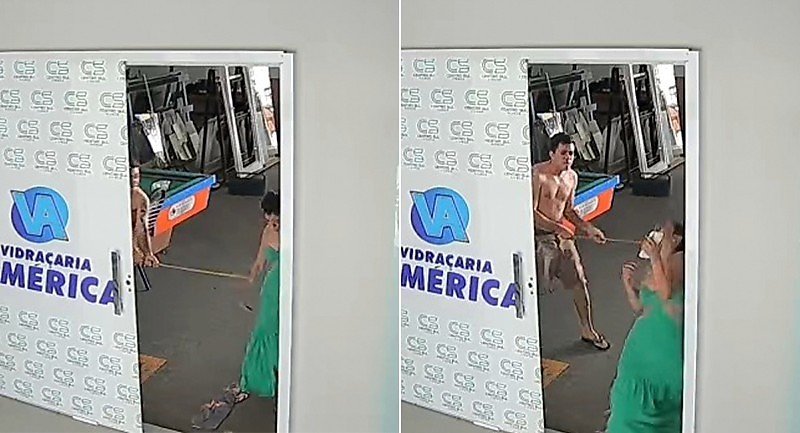 Imagens de uma câmera de segurança captaram o momento em que a mulher foi agredida. Nas imagens, ela aparece correndo do agressor, que estava com o taco de sinuca na mão.