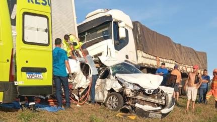 Um grave engavetamento envolvendo seis veículos — três carretas e três automóveis de passeio — deixou duas pessoas feridas na tarde desta segunda-feira (3), no km 342 da BR-364, em Santo Antônio de Leverger, a cerca de 34 km ao sul de Cuiabá.