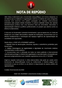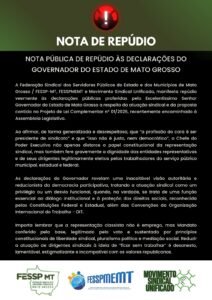 A Federação Sindical dos Servidores Públicos do Estado e dos Municípios de Mato Grosso (FESSP-MT) e a FESSPMEMT divulgaram, nesta segunda-feira (16), uma nota pública de repúdio às declarações recentes do governador de Mato Grosso sobre a atuação de dirigentes sindicais e o Projeto de Lei Complementar nº 01/2026, encaminhado à Assembleia Legislativa.