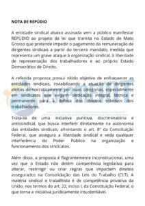 A FESSPMEMT (Federação dos Sindicatos de Servidores e Funcionários Públicos Municipais de Mato Grosso) repudia o avanço do projeto em discussão na Assembleia Legislativa de Mato Grosso (ALMT) que busca limitar a licença sindical remunerada. A medida tem gerado tensão entre entidades sindicais e parlamentares.