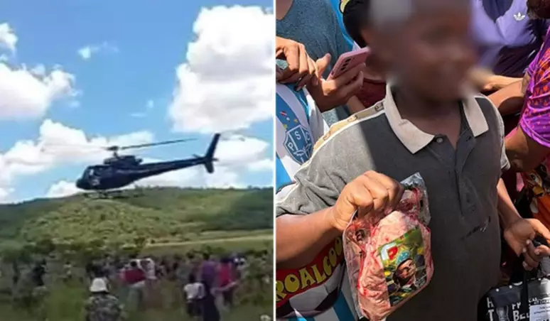 Um helicóptero do Frigorífico Goiás lançou carnes para moradores de Aparecida de Goiânia, na Região Metropolitana de Goiânia, na véspera de Natal. Imagens que circulam nas redes sociais mostram a aeronave sobrevoando uma área de pasto enquanto uma multidão corre atrás das doações, gerando polêmica nas redes sociais.