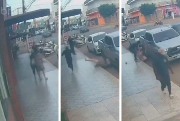 O homem continua andando como se nada tivesse acontecido. Uma mulher que presenciou a cena corre na direção da idosa para ajudá-la.