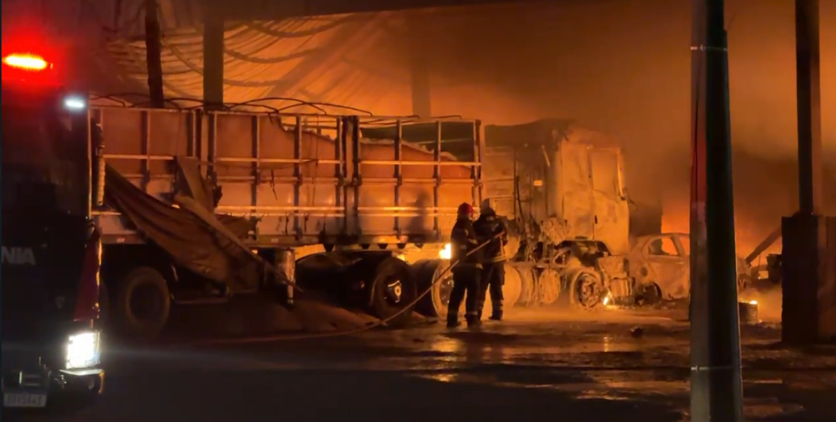 Uma equipe do Corpo de Bombeiros foi acionada por volta das 22h20 para atender a um incêndio de grandes proporções em uma empresa. No local, 8 caminhões e dois veículos de passeio já haviam sido consumidos pelo fogo. Havia grande quantidade de material inflamável no lugar.