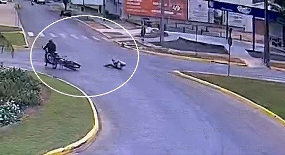 Nas imagens, é possível ver que a moto do condutor toca na lateral de um segundo veículo que trafegava pela via. Com o impacto, o motociclista é arremessado para a frente, mas recupera o equilíbrio no mesmo movimento da queda. Ele se levanta imediatamente, aparentemente sem ferimentos graves, e se afasta da pista.