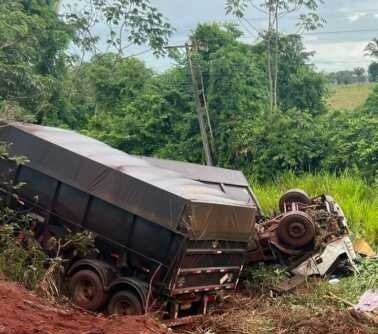 Motorista perde controle, tomba caminhão e é lançado para fora do veículo em Tangará