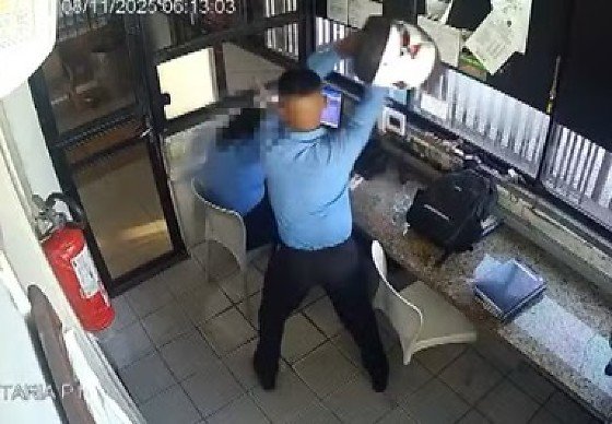 Nas imagens, é possível ver o momento em que a vítima discute com o agressor, que pega um capacete em cima da mesa e o golpeia na cabeça da mulher, enquanto ela tenta se proteger com as mãos. Após as agressões, o homem recolhe seus pertences, dá um tapa na vítima e sai do local.