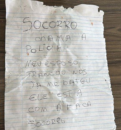 No local, os militares encontraram um bilhete com a seguinte mensagem: “Socorro, chama a polícia. Meu esposo nos trancou e já me bateu. Ele está com uma faca. Socorro”.