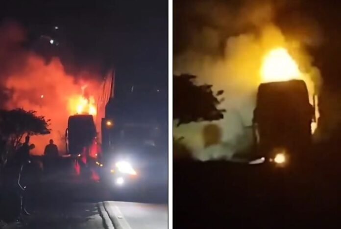 Um ônibus que transportava 40 passageiros pegou fogo, na sexta-feira (2), quando transitava pela rodovia estadual MT-358, nas proximidades da Fazenda Salto das Nuvens, em Tangará da Serra (253 km de Cuiabá). Não há relatos de feridos.