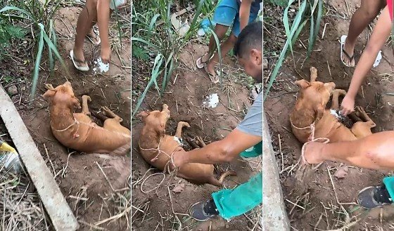 Um cachorro da raça pitbull foi resgatado em estado crítico após ter sido enterrado ainda com vida em um terreno baldio, na tarde do último sábado (3), em Cuiabá. A dona do animal, uma jovem de 25 anos, foi presa pela Polícia Militar e afirmou que o marido seria o responsável por “dar um fim” ao cão.