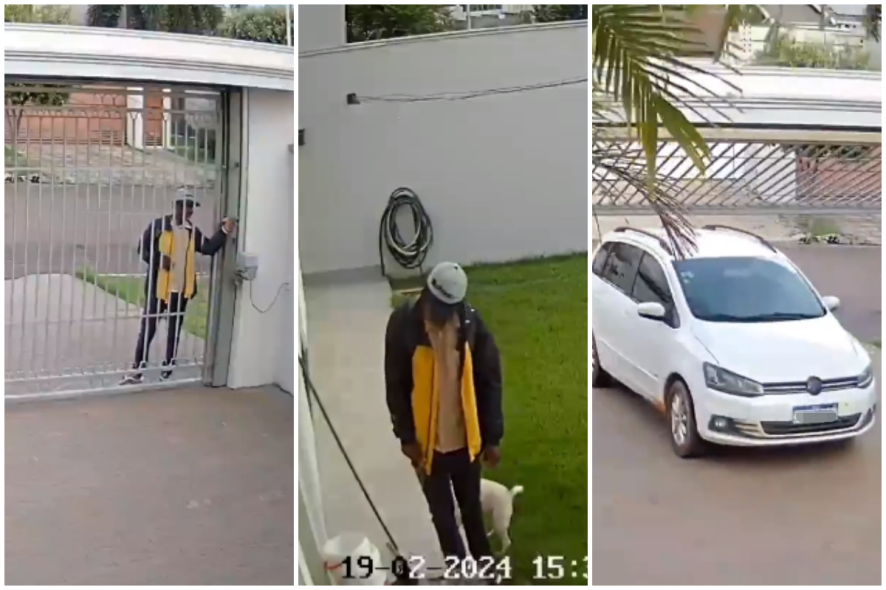 A ação do ladrão foi gravada por câmeras de segurança da casa, localizada no Bairro Jardim Araguaia. Nas imagens, é possível ver que ele entra normalmente pelo portão, que estava destrancado, e até brinca com os cachorros da família.