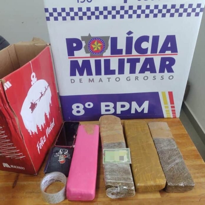 Durante barreira policial na rodovia MT-208, a equipe do 8º BPM realizou abordagem a uma motocicleta Honda Biz 125 vermelha, conduzida por um homem. Em verificação minuciosa, os militares encontraram uma caixa contendo quatro tabletes de maconha, no baú do veículo.