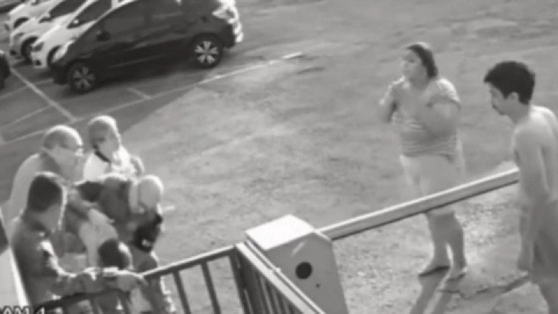 A ação foi registrada por câmeras de segurança. Nas imagens é possível ver a mulher descendo desesperadamente com a criança nos braços e corre em direção aos militares, para quem pede por ajuda. A ação foi rápida e eficaz.