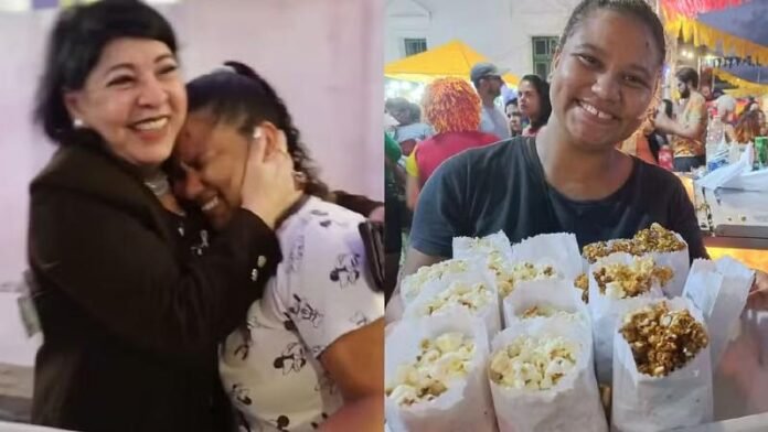 “Eu não estava acreditando. Roberta perguntou quantas pipocas ela tinha que pagar e eu estava desnorteada da cabeça. Ela perguntou se R$ 50 dava e eu disse que sim, mas ela puxou uma nota de R$ 200. Nessa hora, não acreditei, achei que estava sonhando, que iria acordar a qualquer momento. De repente, ela puxou mais uma nota de R$ 200. Então, comecei a tremer e chorar”, relembra a vendedora.