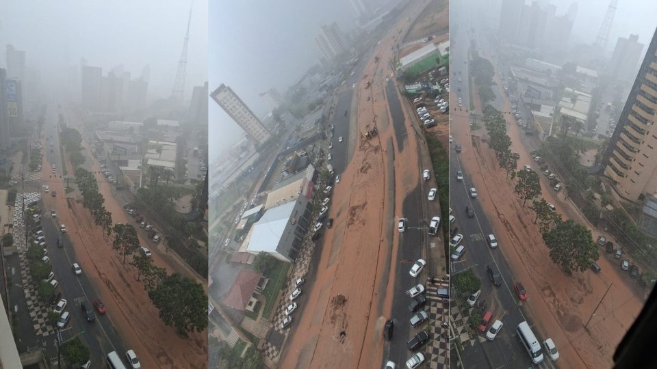 Nesta quarta-feira, 7 de janeiro de 2026, um forte temporal atingiu Cuiabá e transformou o canteiro de obras do BRT na Avenida do CPA em um grande lamaçal.