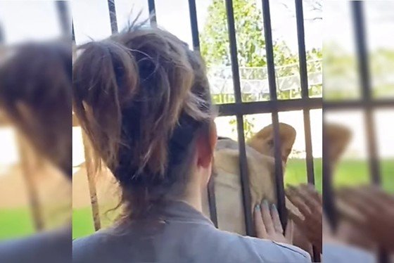 Nas imagens, é possível ver a leoa se esfregando na grade e recebendo o carinho da veterinária. Um homem morreu após invadir o recinto