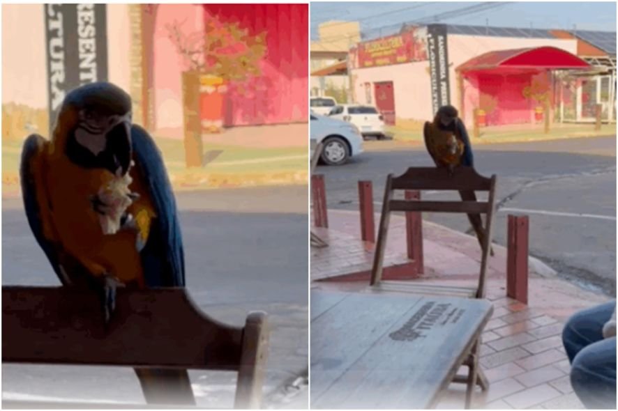 VÍDEO: arara-canindé ‘invade’ café da manhã de casal, come pão e bebe água em padaria de MT