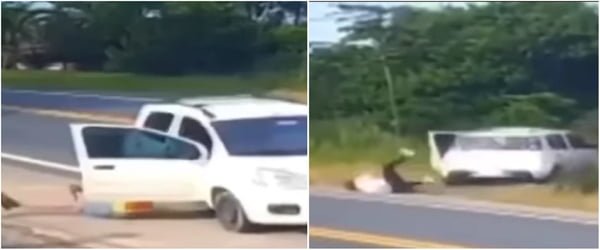 Nas imagens, é possível ver um homem de camisa laranja saindo do veículo antes dele parar, escorregando no chão e atravessando a rodovia. Ele não fechou a porta.