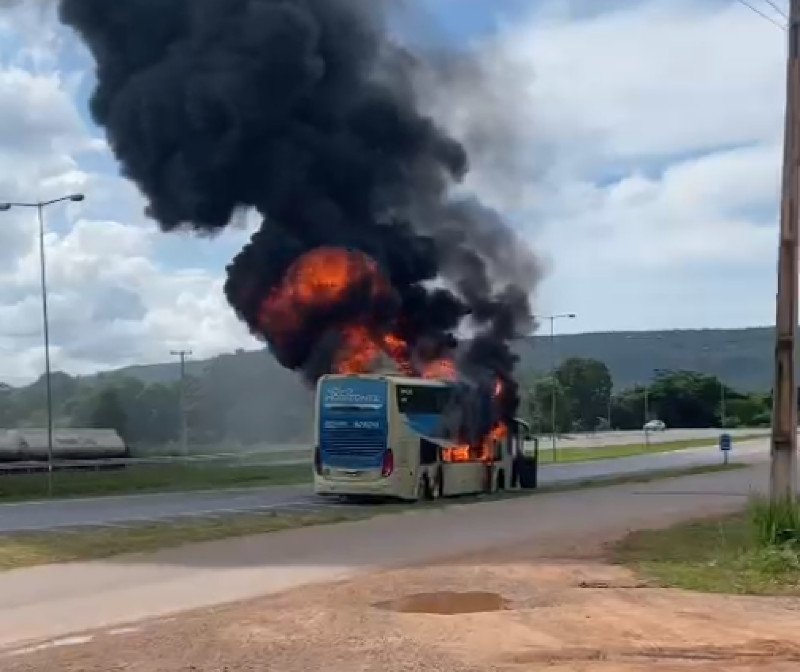 Um ônibus de viagem foi completamente tomado pelas chamas em um incêndio ocorrido na tarde desta segunda-feira (5), na BR-364, próximo a Nobres (a121 km de Cuiabá). No momento, ao menos 15 pessoas viajavam no veículo.