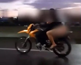 Nas imagens, é possível ver a passageira na garupa da moto sem utilizar capacete e sem vestimenta nas pernas. As imagens foram compartilhadas nas redes sociais e rapidamente se espalharam pela internet.